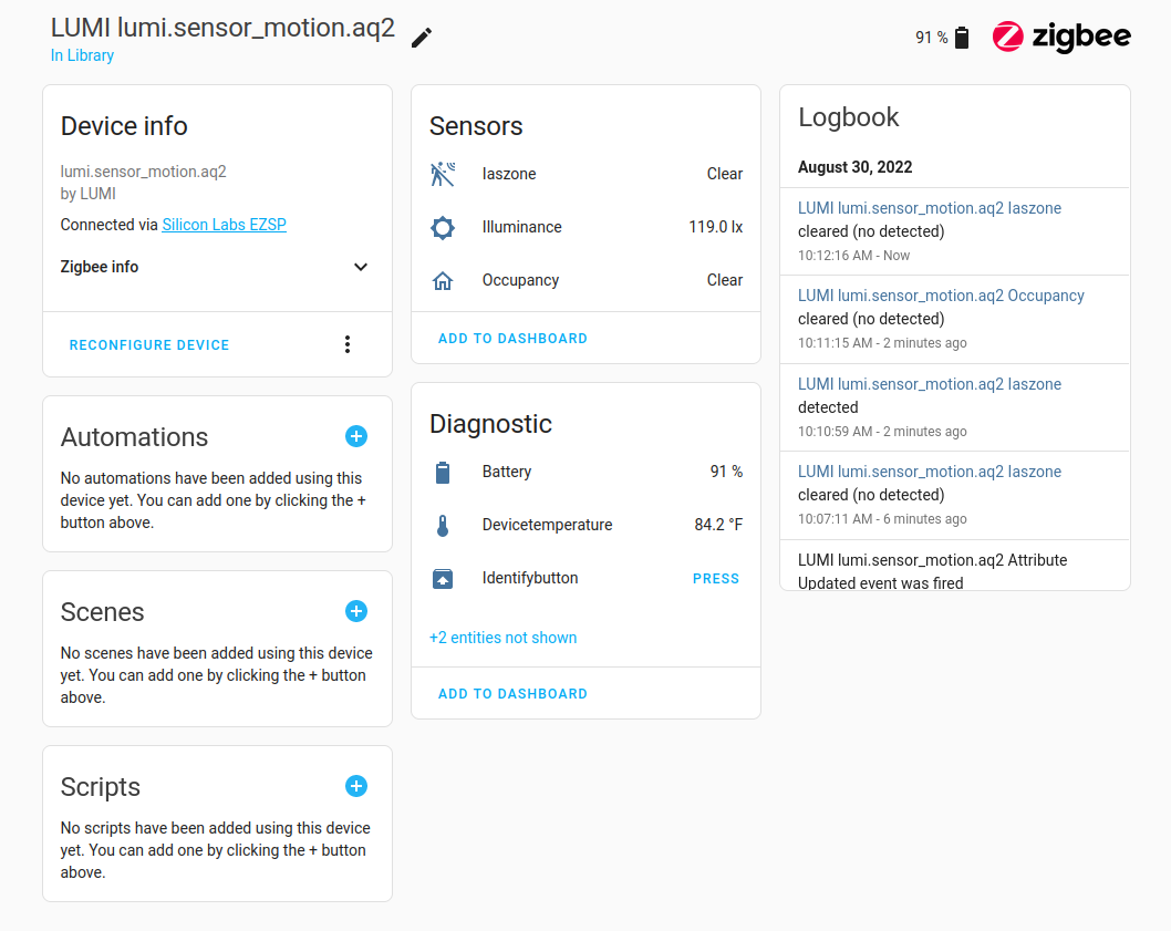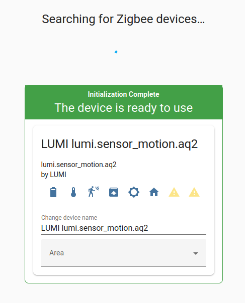 After picking an ‘area’ the device is ready to be used (it might take another 30-60 seconds for the search to finish even after it has found the device, but you can close this page beforehand). For the purpose of this guide, the motion sensor has been assigned to the ‘Library’ area: